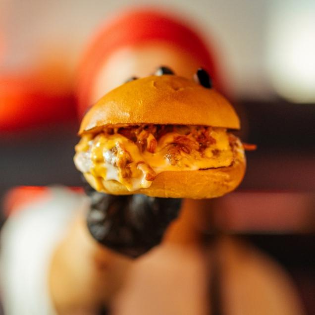 Meşe odununda tütsülenmiş dana eti, tatlı turşu, cheddar peyniri, tütsü peyniri, soğan reçelli mayonez, biber reçeli, soğan kıtırı ve patates