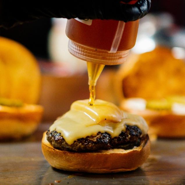 burger köftesi, tatlı turşu, tütsülenmiş gouda ve kars eski kaşarı, soğan reçelli mayonez, bal, kızartması