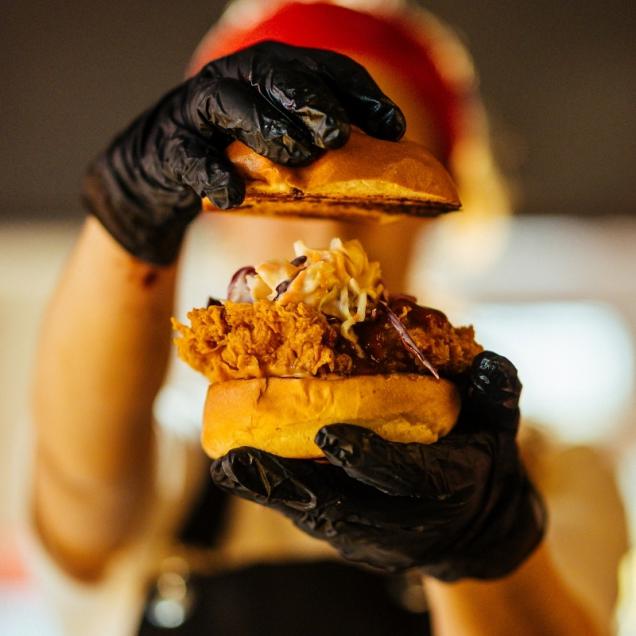 Sriracha soslu çıtır tavuk, tatlı turşu, coleslaw ve biber reçelli mayonez, patates